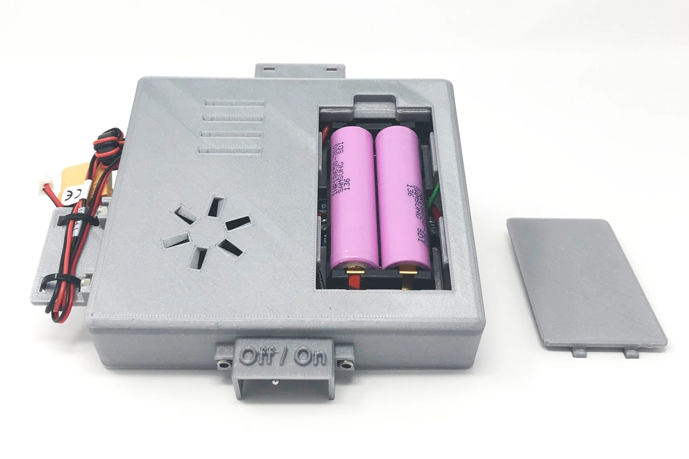 2 x 18650 Lithium-Ion batteries (vape batteries), a BMS to provide protection to the batteries and keep them from over discharging, a 5V / 10 Amp power supply, and fan to keep things cool. On/Off switch on bottom.
